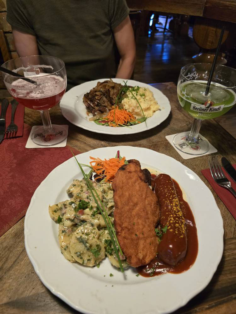 Bei so viel Laufen kommt garantiert Hunger auf. So steuerten wir das Kartoffelhaus am Alex an. Im urig und liebevoll eingerichteten Gastraum gab es schließlich Leber mit Kartoffelstampf für Andrea und Bolte's Platte mit Boulette, Currywurst und Schnitzel an Kartoffelsalat für Frank. Die leckeren Speisen waren sehr üppig bemessen, sodass der Rest eingepackt wurde und für das Mittagessen am Folgetag reichte.