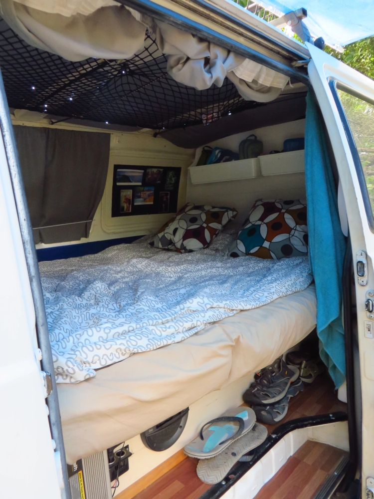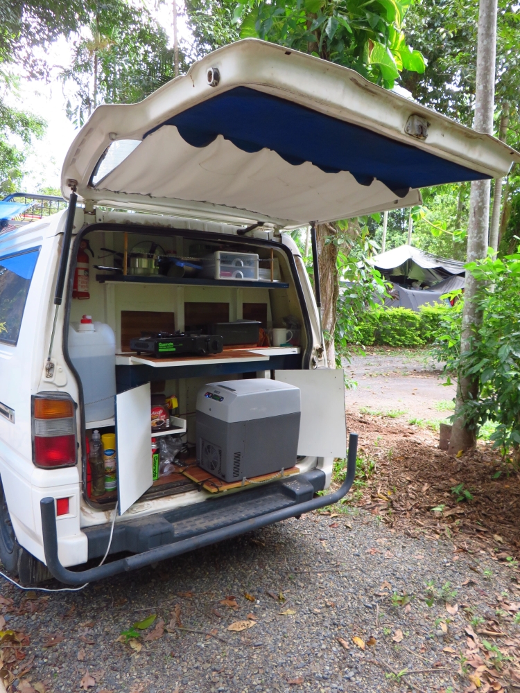 Auf der Weltreise hatte ich in Australien einen Mitsubishi L300 „Express“ mit Campingumbau. Im Vergleich zu vielen anderen Campingbussen handelt es sich um ein kleines Fahrzeug. Dementsprechend fiel die Ausstattung eher spartanisch aus, keine Frage. Dennoch habe ich mich darin wohl gefühlt und es war alles Notwendige vorhanden. Trotzdem war der Platz stark begrenzt. Neben einem fest verbauten Bett gab es nur die Küche im Heck. Stauraum befand sich unter dem Bett und war nur durch Anheben des gesamten Bettes erreichbar. Es gab also keine echte Sitzmöglichkeit und bei schlechtem Wetter konnte drinnen nicht gekocht werden.