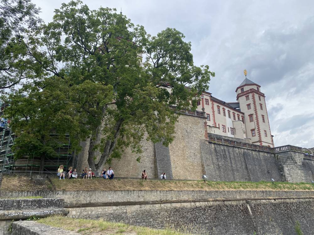 Von der Fußgängerzone aus führt die Alte Mainbrücke über den gleichnamigen Fluss. An beiden Brückenenden wird regionaler Wein angeboten, der von zahlreichen Gästen auf der Brücke genüsslich getrunken wird. Wir konnten zum Glück widerstehen. Stattdessen machten wir uns an den kräftezehrenden Aufstieg zur Festung Marienberg. Von der äußeren Burgmauer hatten wir einen beeindruckenden Blick über Würzburg. Die Festung selbst war wegen umfangreicher Sanierungsarbeiten zwar geschlossen, dennoch konnten man bereits von außen die Pracht und die Macht der Festung förmlich spüren. Leider zwang uns das Wetter frühzeitig wieder in die Stadt hinabzusteigen. Gerade noch rechtzeitig schlüpften wir bei einem Bäcker rein, bevor ein ordentlicher Regenguss die Straßen leerfegte.