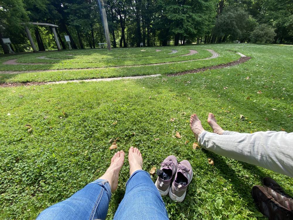 einen schön angelegten Park, in dem wir ein Barfußlabyrinth entdeckten. Kurzentschlossen schlüpften wir aus unseren Schuhen und