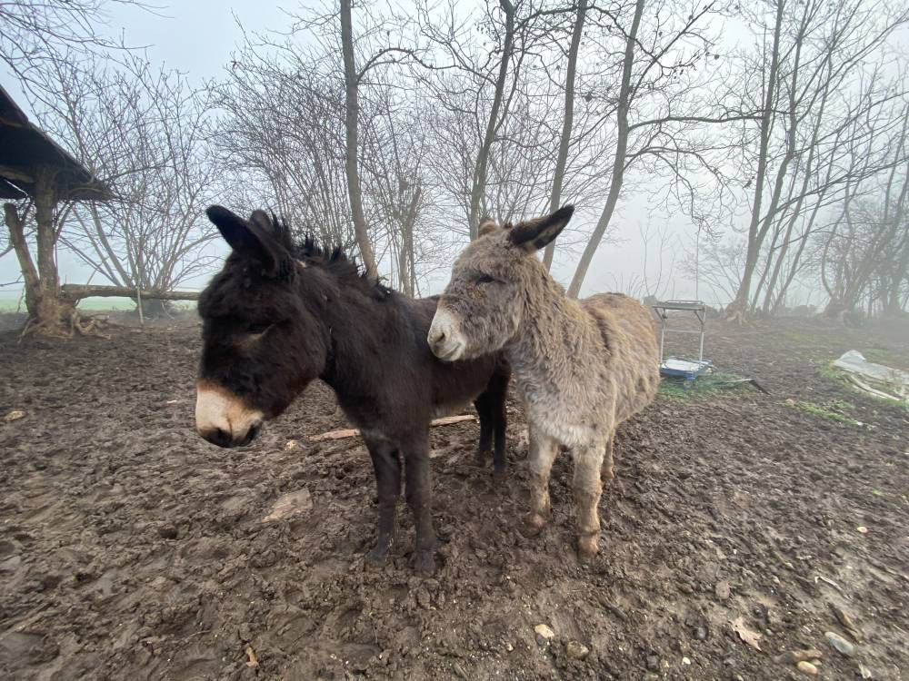 Neben ein paar lärmenden Gänsen hatten wir gleich noch Anschluss zu zwei sehr anhänglichen Eseln und lieben Hunden.