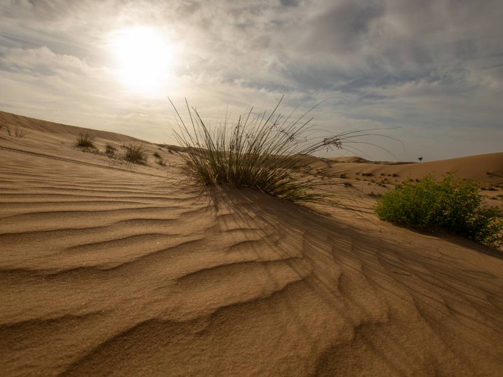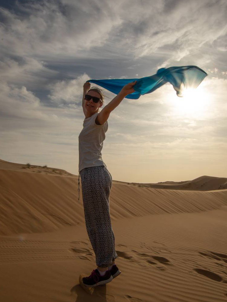 Nach diesem zugegeben teuren Genuß ging es mit dem Taxi zurück ins Hotel, denn es stand noch ein weiteres Highlight an: eine Wüstentour, die wir ebenfalls über GetYourGuide gebucht hatten. Wieder wurden wir pünktlich abgeholt und es ging hinaus zur Al Khatim Wüste. Dort angekommen ließen die Fahrer zunächst etwas Luft aus den Reifen für besseren Grip, dann ging es mitten hinein. Mit halsbrecherischem Tempo und in waghalsigen Manövern ging es über die Sanddünen. Bei einem Fotostopp wurden wir regelrecht gesandstrahlt und hatten endlich eine Ahnung, warum die Beduinen immer Tücher umbinden. Die Kamele eines Beduinen erwiesen sich dann als sehr verschmust und fotogen. Die Fahrt endete bei einem Beduinencamp, wo es verschiedene Aktivitäten wie einen sehr kurzen Kamelritt, Sandboarding und Fotos mit einem Falken gab. Außerdem konnten wir uns in traditionelle Gewänder hüllen. Dabei erhielt Andrea ihren neuen Beinamen „Fatima“, was uns mit „beautiful“ übersetzt wurde. Vermutlich wurden schon einige der Besucherinnen mit dem Namen versehen 😉. Später gab es leckeres Essen und dann eine Tanz- und Feuershow, bevor es wieder zurück nach Abu Dhabi ging.