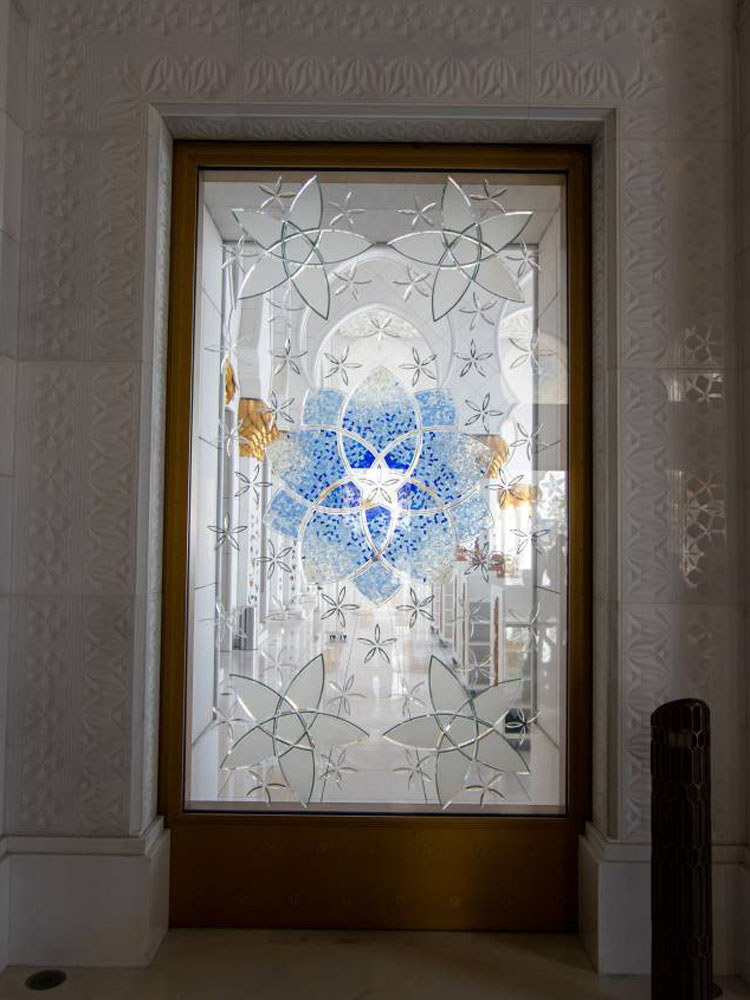Weiter ging es zur Großen Moschee oder auch Schaich-Zayid-Moschee. Wie in allen Moscheen üblich, ist eine Kleiderordnung einzuhalten. Herren dürfen T-Shirts tragen, aber lange Hosen sind Pflicht. Bei Frauen muss die Kleidung bis zu den Knöcheln bzw. den Handgelenken reichen und ein Kopftuch ist Pflicht. Da uns dies bereits bewusst war, hatten wir entsprechend vorgesorgt. Die schneeweiße Moschee hat beeindruckende Ausmaße. Der riesige Innenhof ist mit Mosaiken geschmückt und von Säulengängen umgeben. Kronleuchter mit Swarovskikristallen zieren den Gebetsraum ebenso wie ein gigantischer handgefertigter Teppich. Buntglasfenster lassen Licht herein und Wasserbecken umschließen die Moschee.